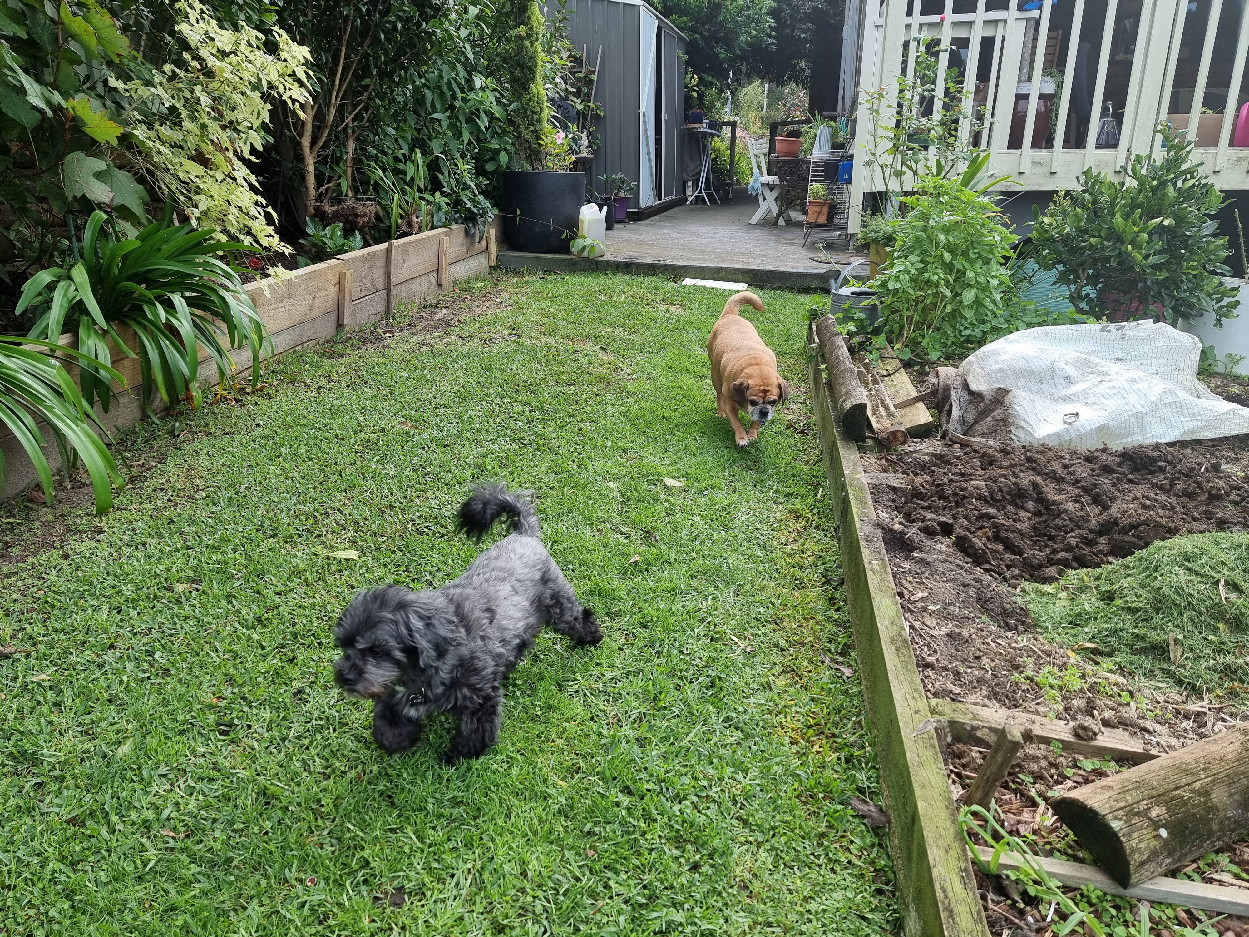 Chuck enjoyed snuffling around the Parentals garden with his cousin Coco.